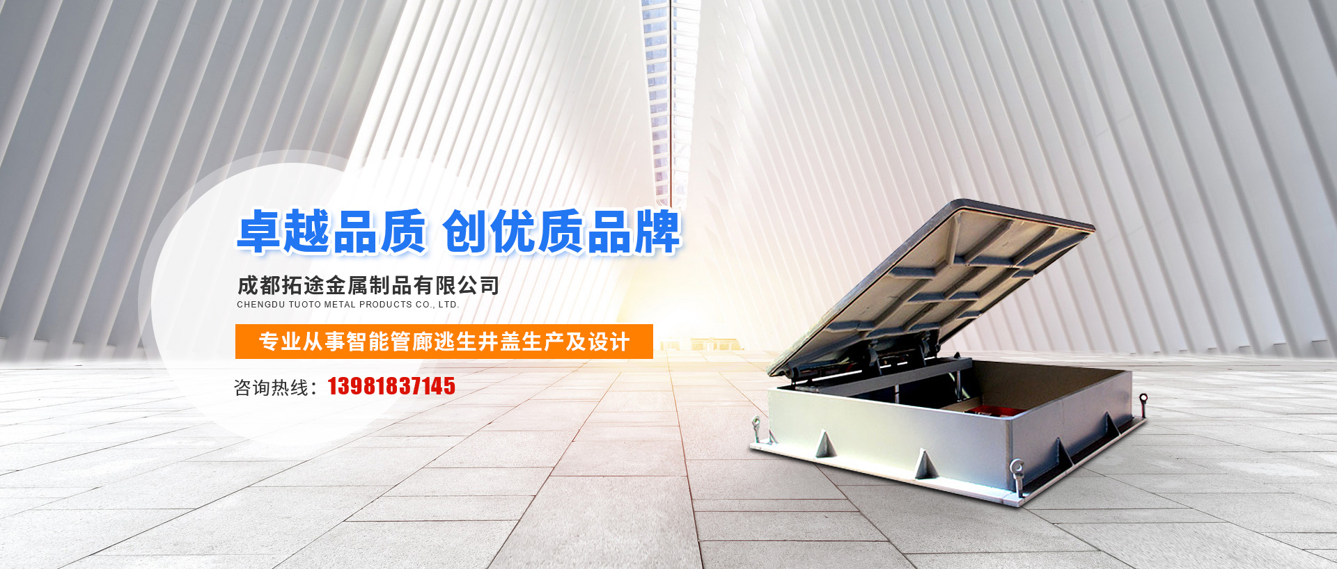 成都拓途金屬制品有限公司成立于2015 年2月,座落于成都金牛高科技產業園興川路866號,公司專業從事交通及公共管理用器材的研發、設計、生產。主要產品:管廊逃生井蓋,管廊通風口,管廊投料口及智能交通控制系統。我們始終堅持以科技求發展,質量求生存,追求卓越,真誠服務的企業宗旨為目標,力求給廣大新老客戶提供優質的產品及服務。 我們是一家專業從事智能管廊逃生井蓋生產及設計公司,我公司經營井蓋行業多年,專注于提供種類齊全,高質量,長壽命的智能管廊井蓋,產品涵蓋通...